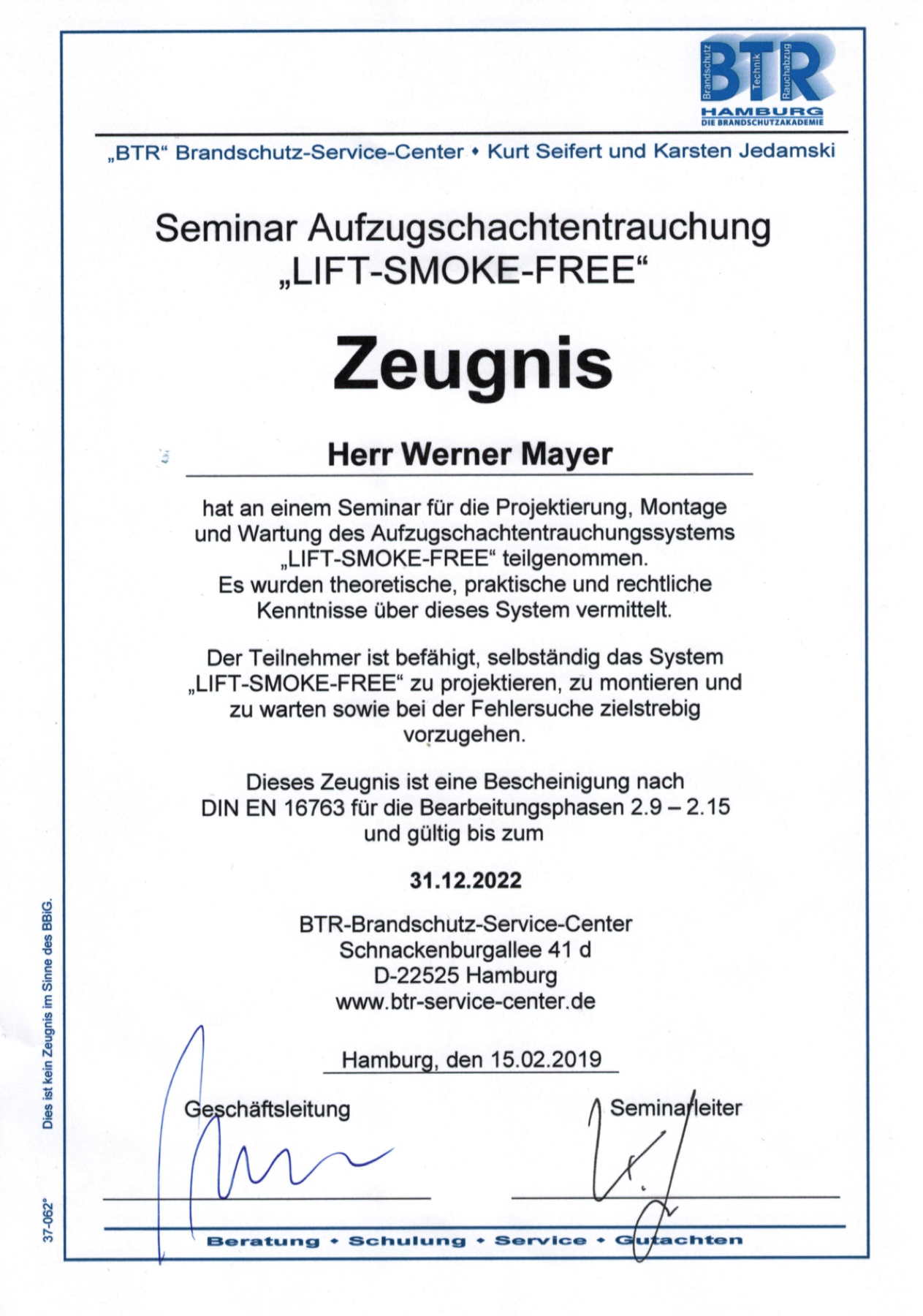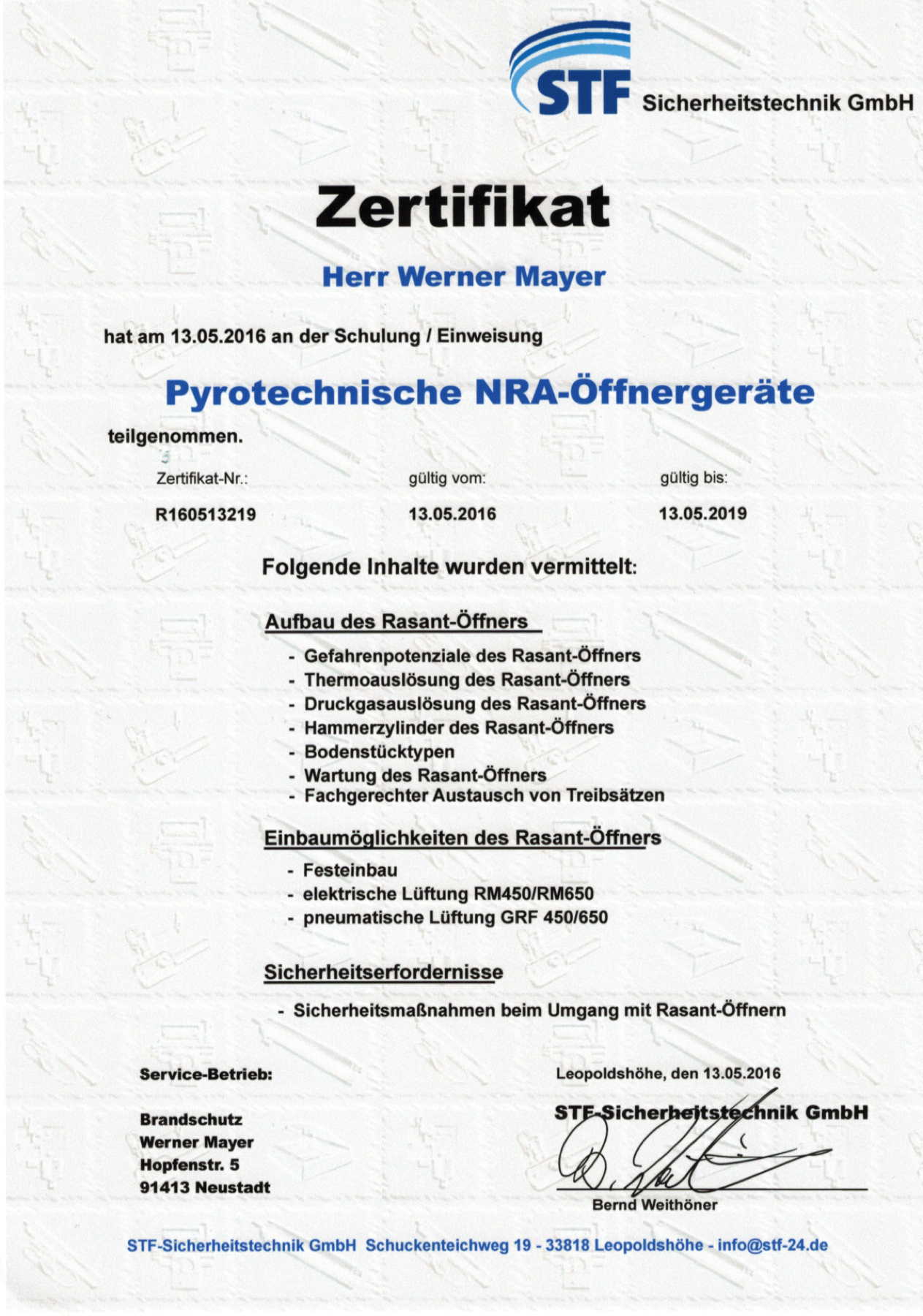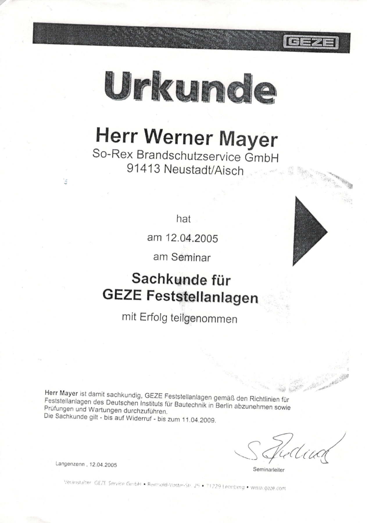 | 2003 | Autorisierter Systemerrichter für SeCa Funk-Sicherheitssysteme |