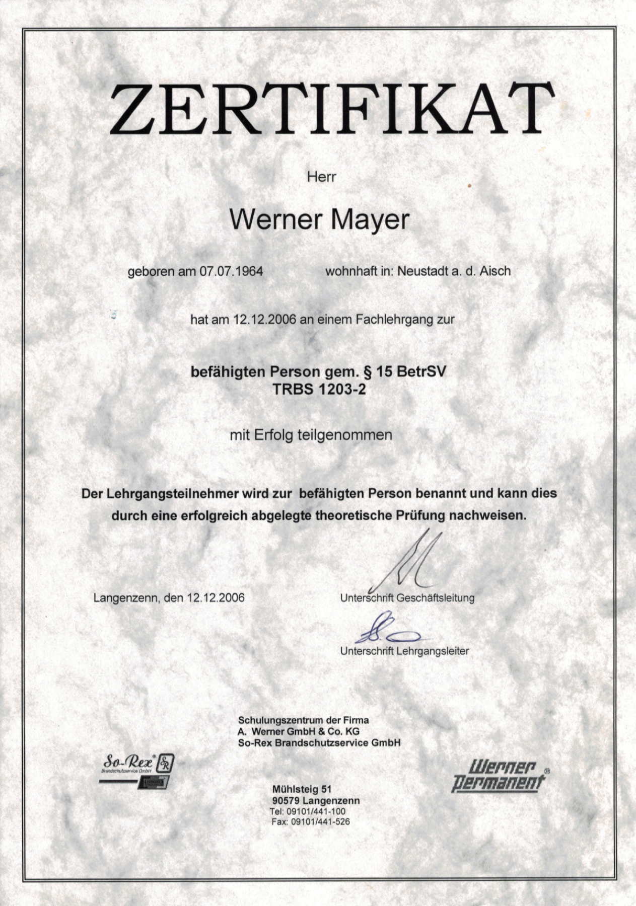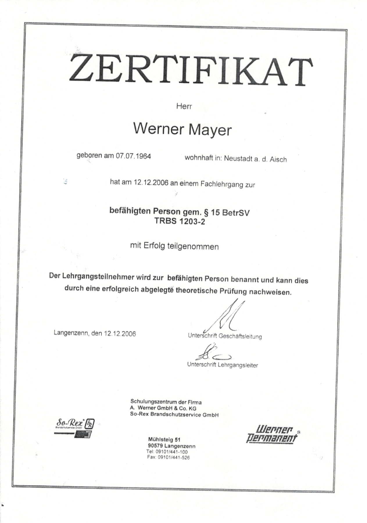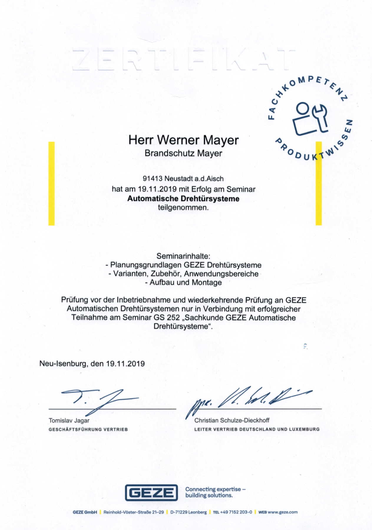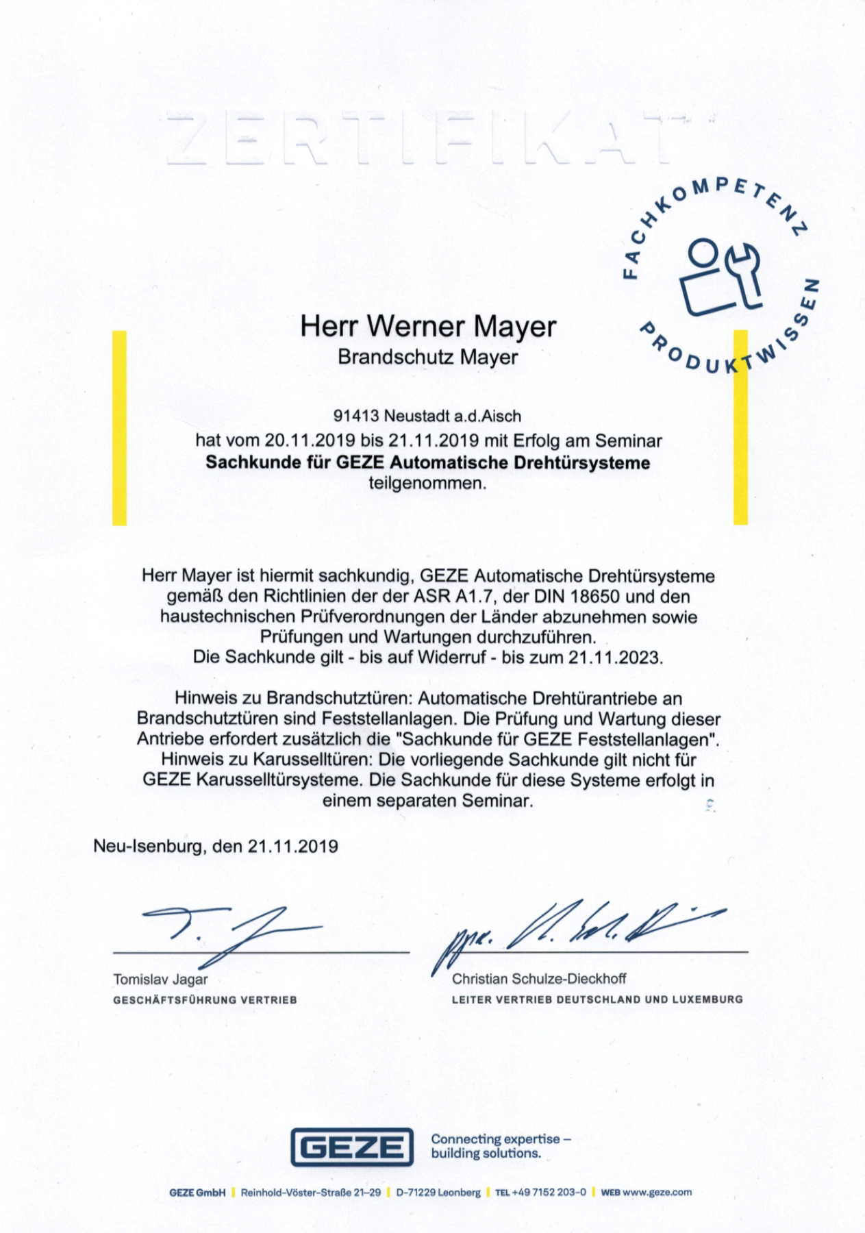 | 2005 | Ausbildung zur Befähigten Person für kraftbetätigte Tore, Türen und Fenster |