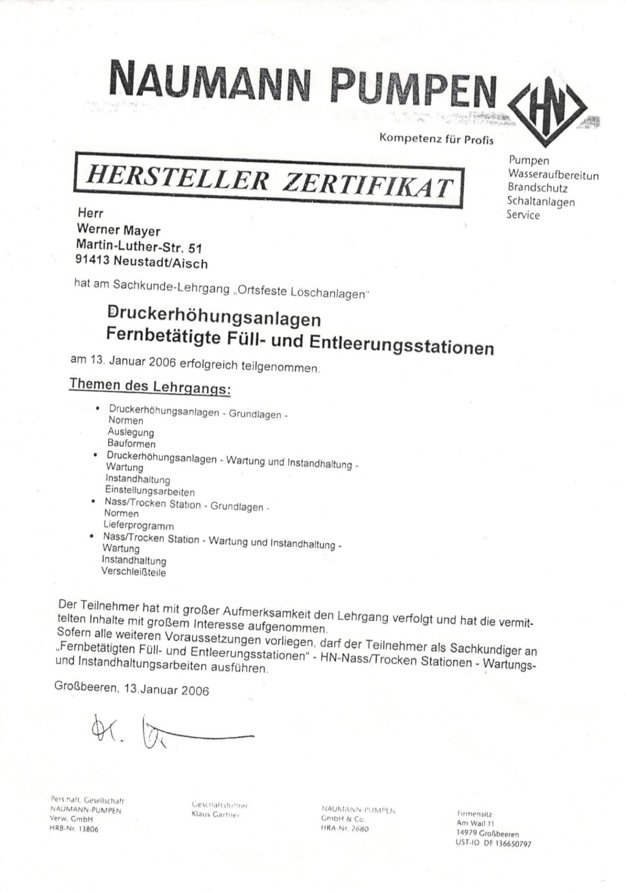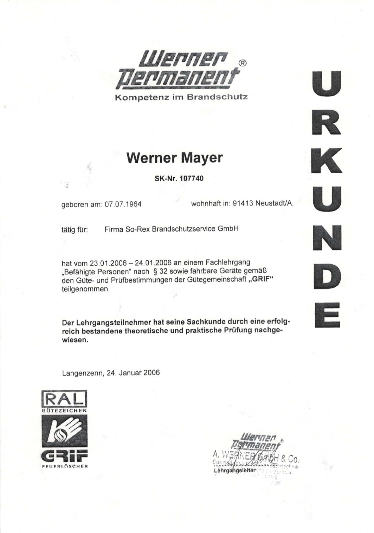 | 2001 | Sachkunde Schulung für Feuerlöscher |