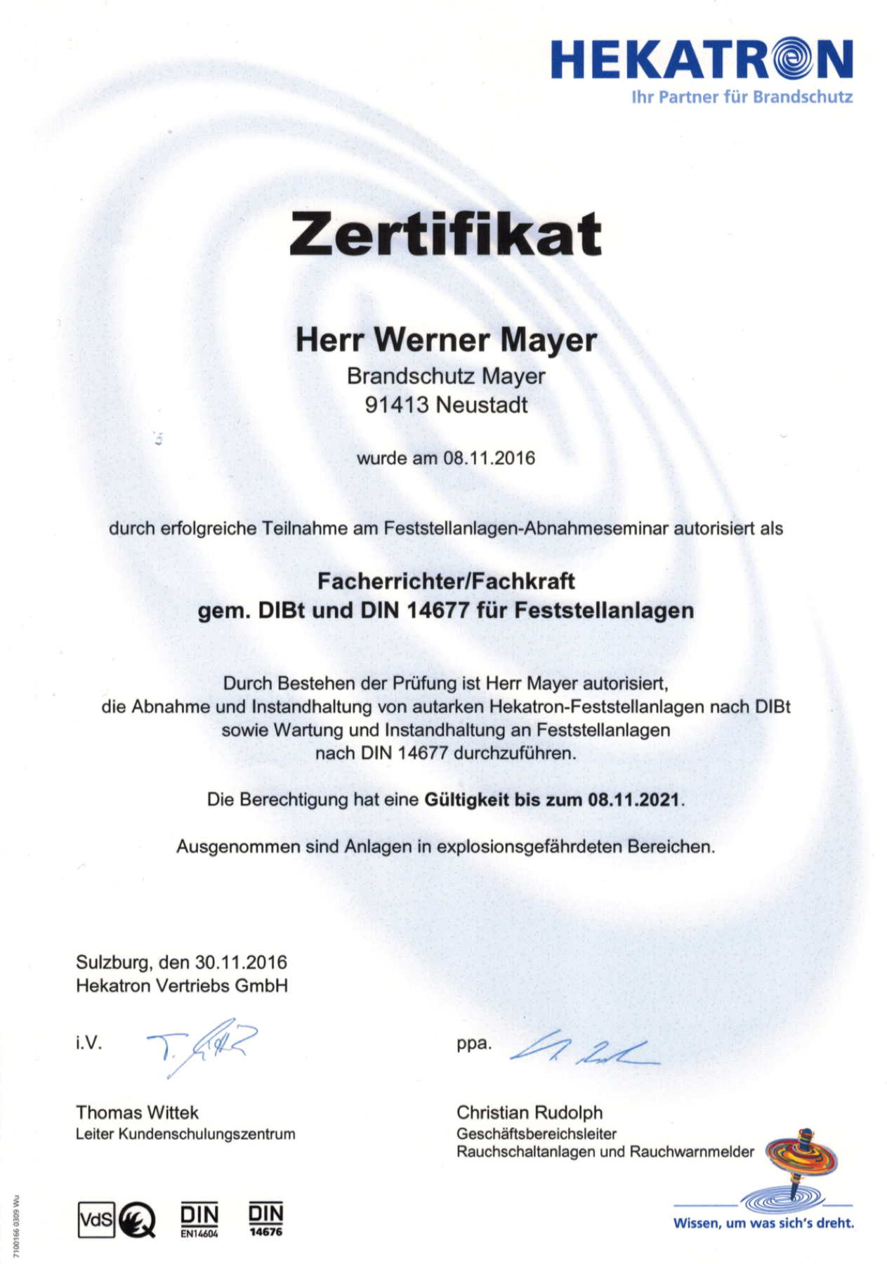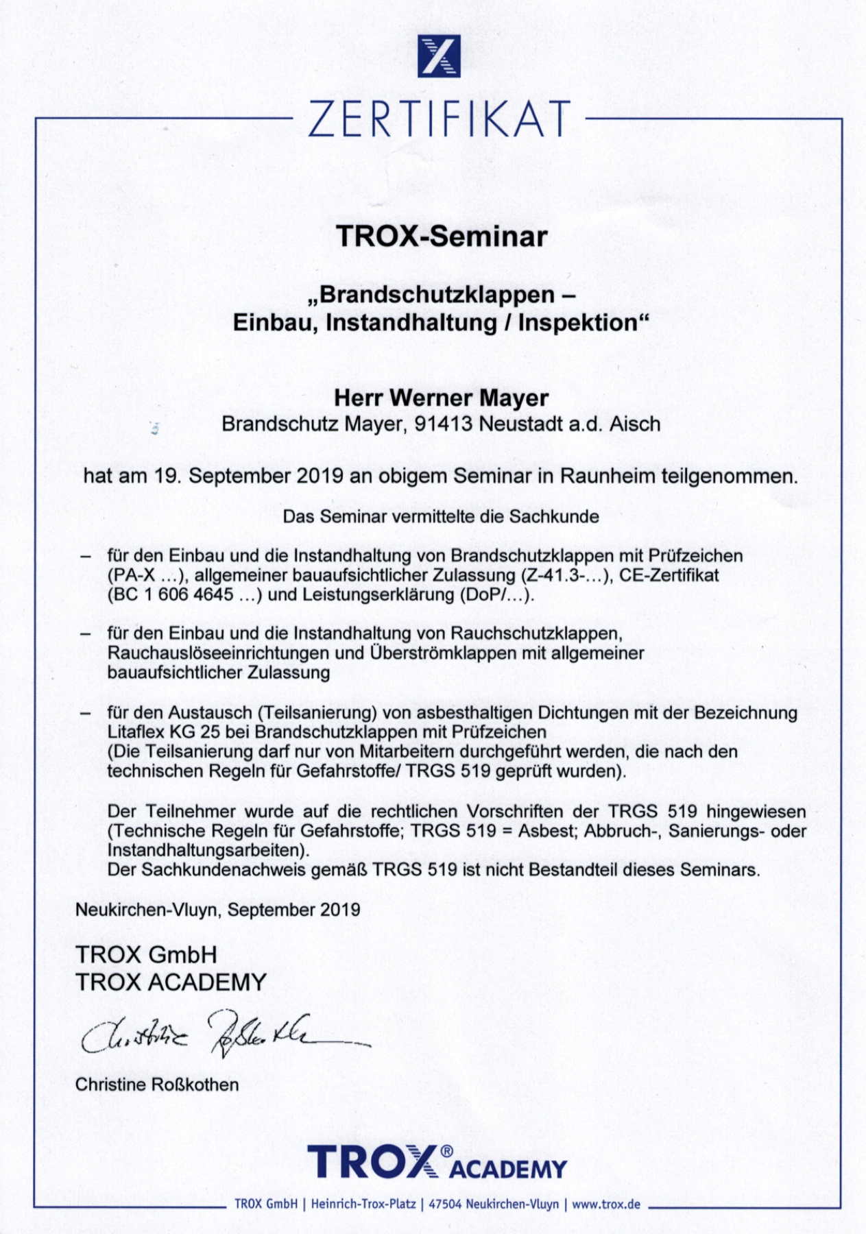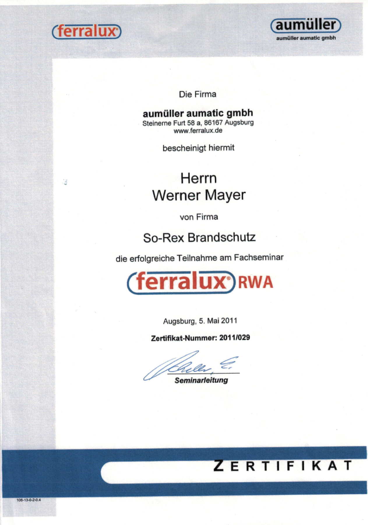 | 2011 | Errichter-Fachschulung für RWA´s (Fa. Feralux/Aumüller) |