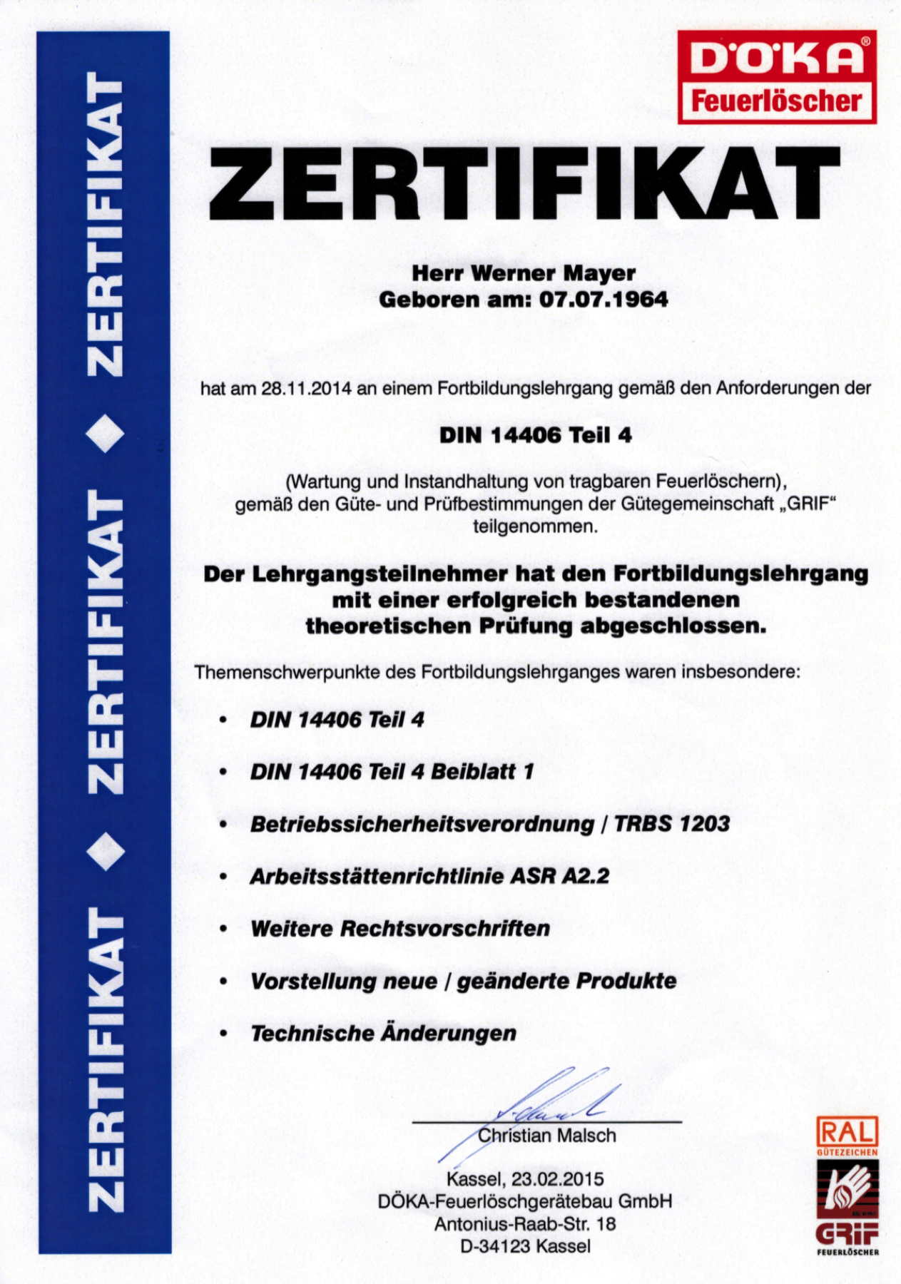 | 2012 | Brandschutzbeauftragter nach R12/09-01 und BG1560 bei TÜV Süd |