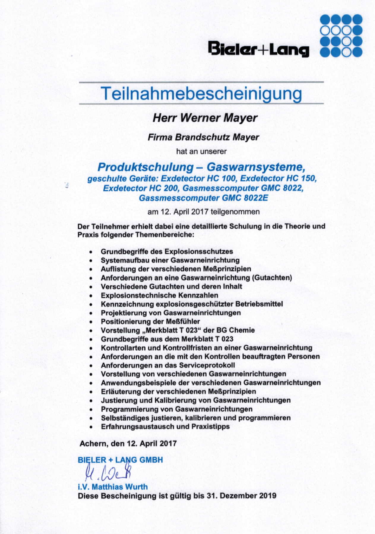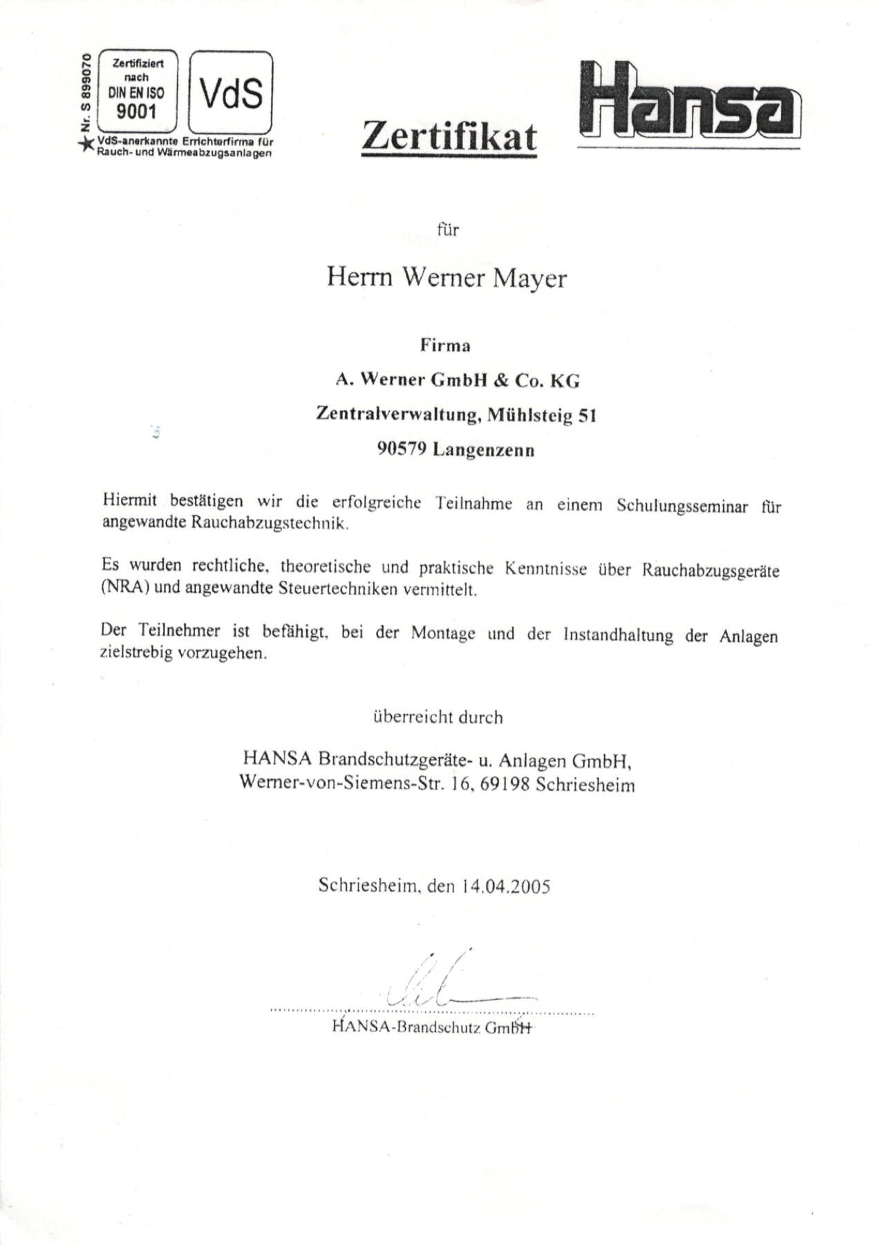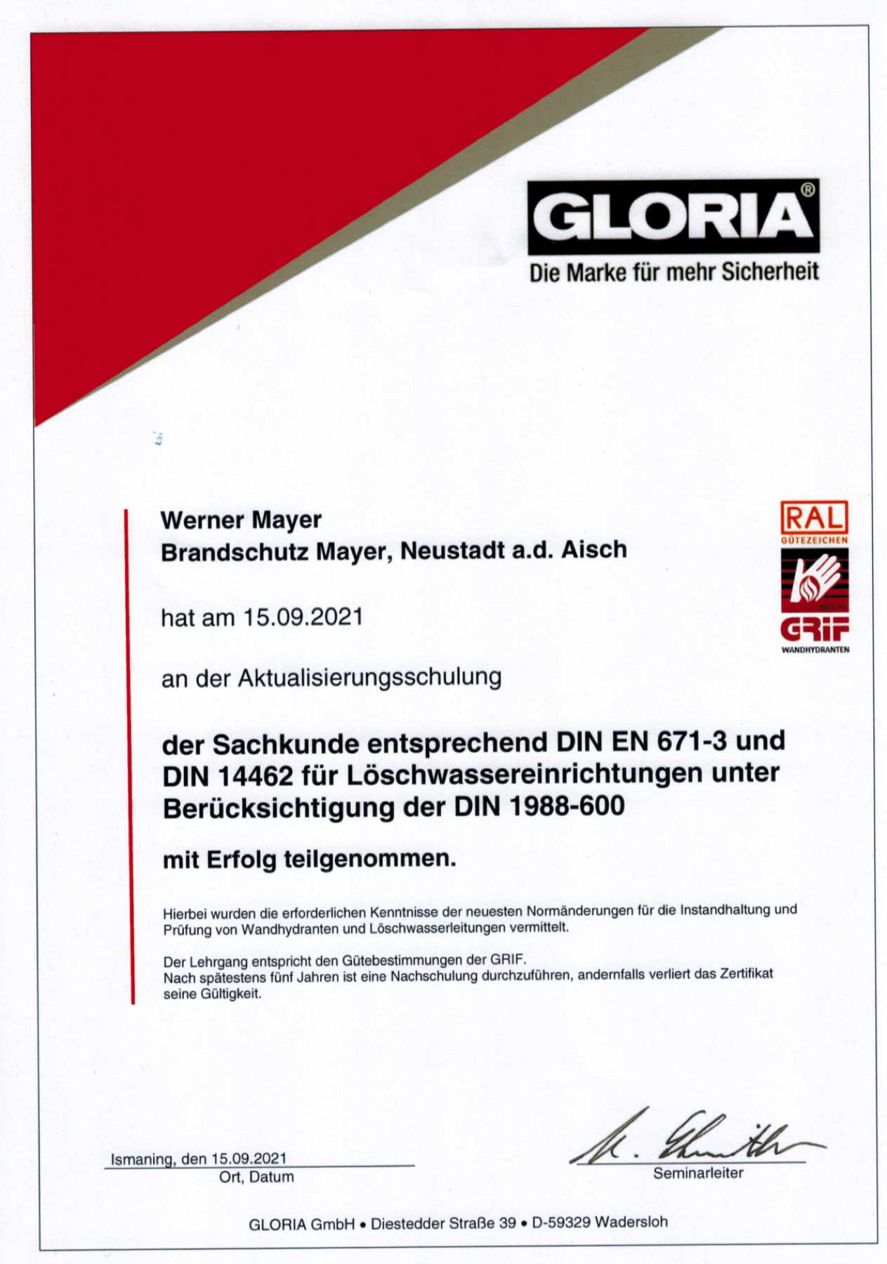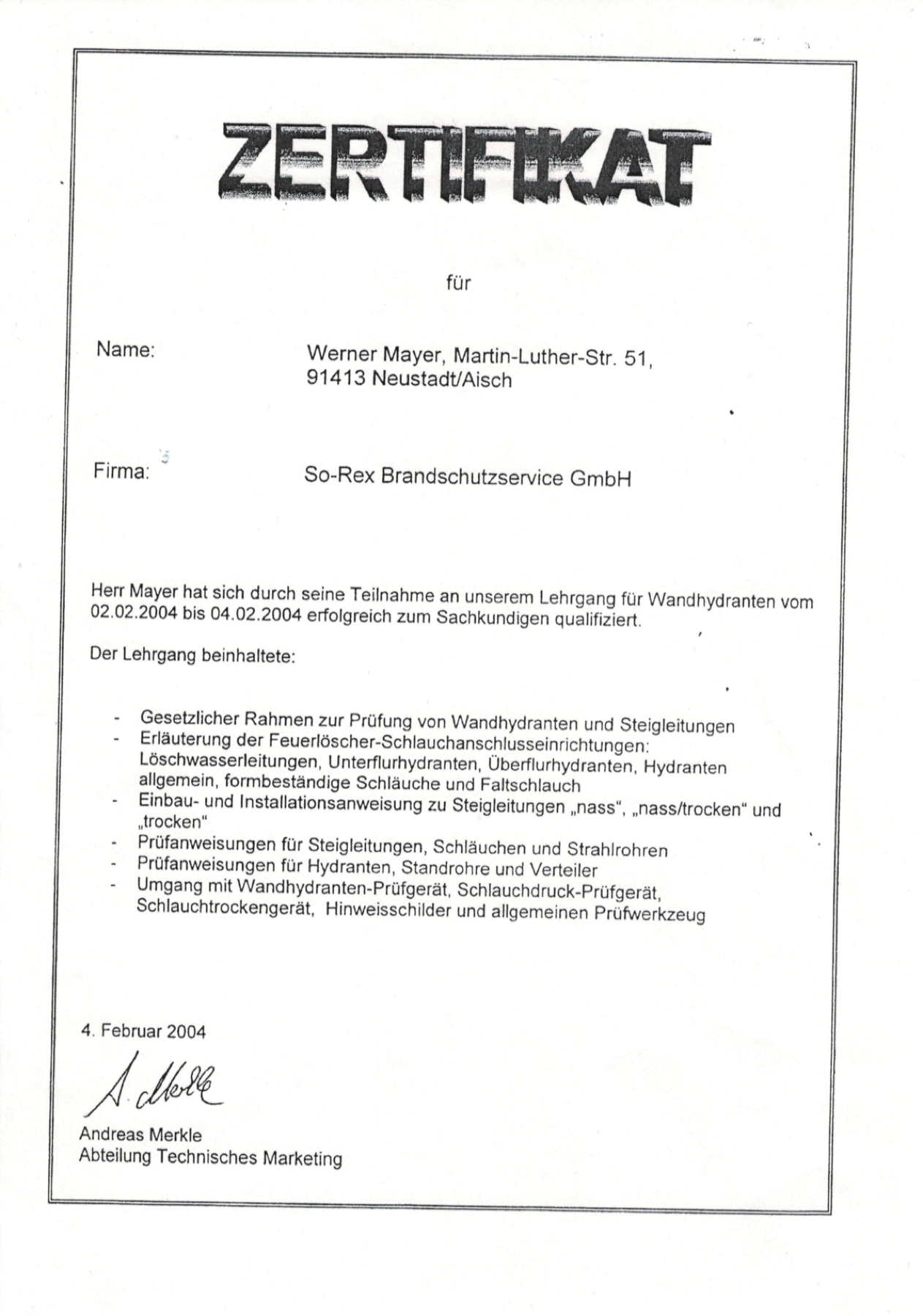 | 2004 | Wandhydranten- und Löschwassertechnik Schulung |